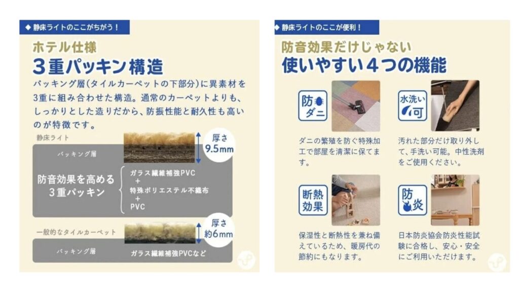 防音マットや静音対策は、集合住宅や夜間使用を考える方には必須。 → 我が家では「静床ライト」を使用し、階下への振動や音をしっかり軽減できました。