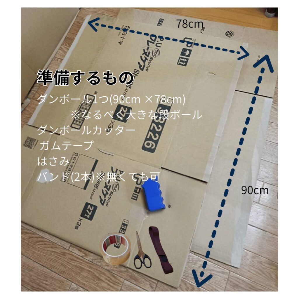 1.準備する物:ダンボール(90cm ×78cm)1枚、段ボールカッター、ガムテープ(必要に応じて✂️ハサミ)、トラベル結束バンド