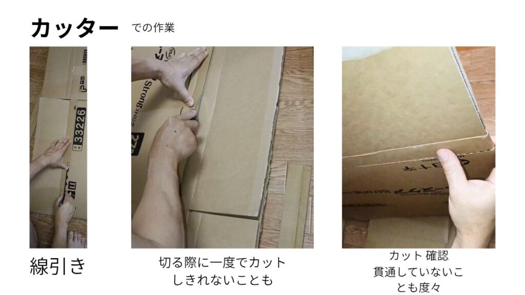 🧩 ダンボールは定規で押さえ、段差や折れ目は無理に一発で切らない。