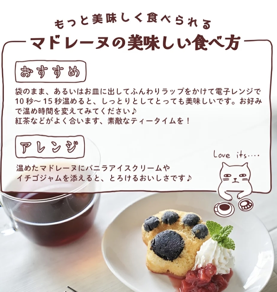 猫の肉球を模したマドレーヌ。ふんわりとした食感と優しい甘さが特徴。そのままでも、アレンジしても可愛らしいですね。以前アイスと一緒に頂きました。自宅でカフェ気分。