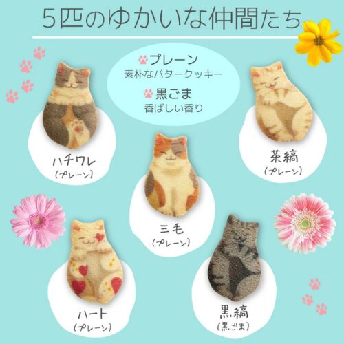 個包装、ゴマとプレーンの2種類。5匹の猫が見て可愛い。食べて美味しい。お茶の時間が楽しくなりそうですね。
